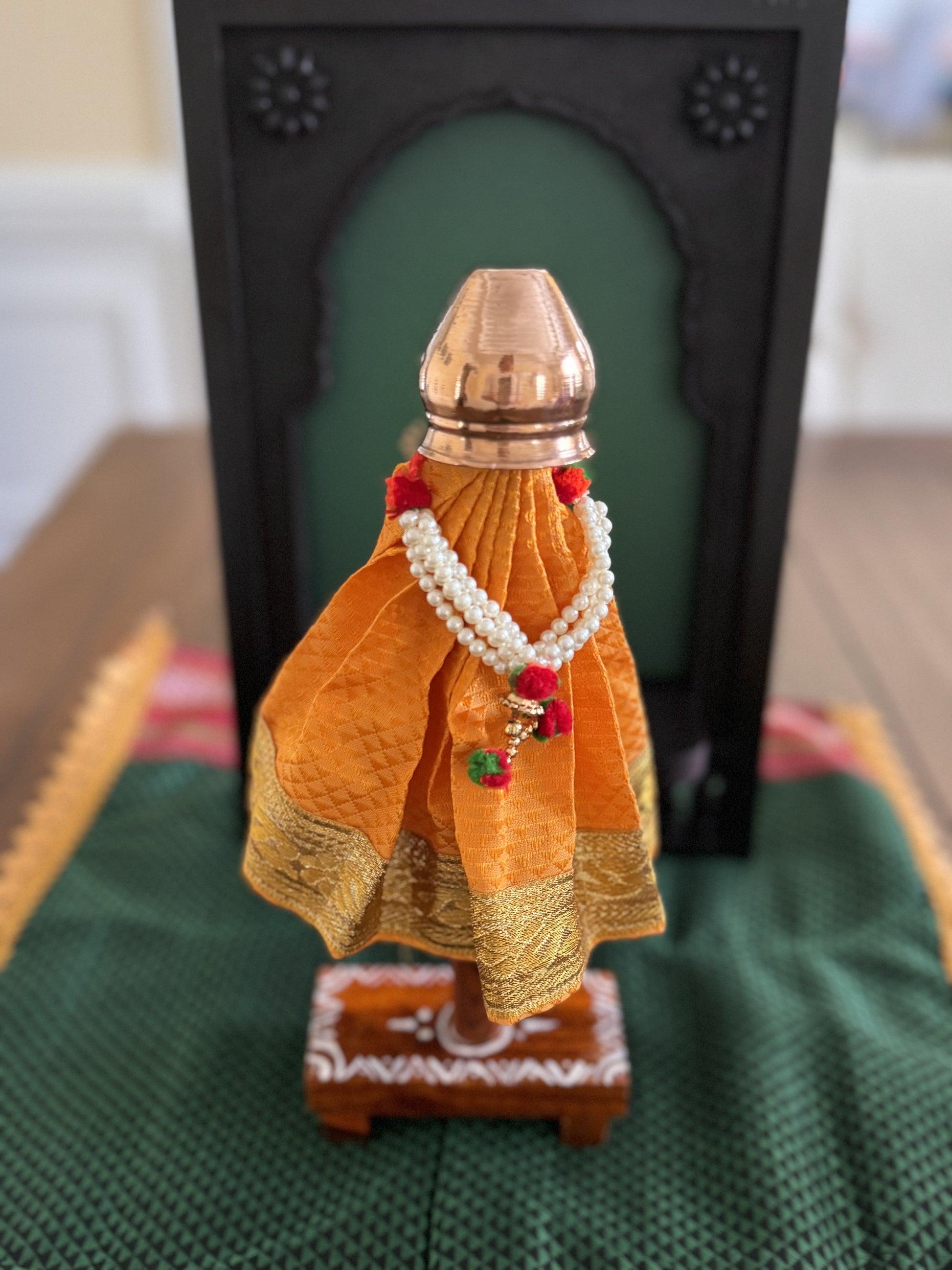 Celebrate Diwali - the festival of light; with cute tabletop. Symbolizing celebration and achievement, this bright and colorful satin scarf capped with a copper kalash adorned with kundan adds an elegant touch to your household. Standing at 10" tall, it's the perfect addition to your festive decor.